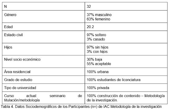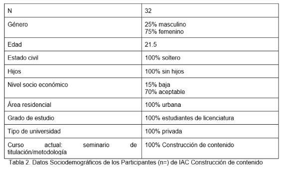 Los estudiantes que integraron el grupo de IAC en la asignatura para la construcción de contenidos y Metodología de la investigación (ciclo escolar 20/2), no conforman una muestra probabilística puesto que fueron grupos asignados. El grupo se formó de las siguientes carreras: derecho (12 estudiantes), comunicación (9), pedagogía (5) y psicología (6). Véase la tabla 4: