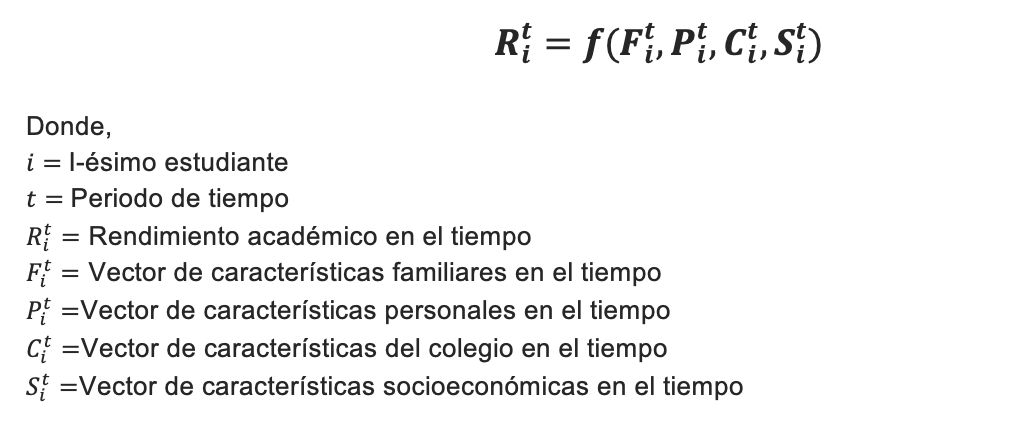 La formalización teórica de éste análisis se inspira en el trabajo sobre las funciones de producción de la educación de Hanushek* en 1986, donde clasifica los insumos en la producción educativa como insumos familiares (características, educación de los padres, ingreso y tamaño de la familia); insumos que evidencian el impacto de pares (peer-effect), como indicadores agregados de las características socio-demográficas de los otros estudiantes de la escuela; insumos escolares como las características de los docentes (educación, experiencia y género), del colegio (tamaño de clases, instalaciones y gastos administrativos), y factores del contexto local (nivel de gasto promedio) (Hanushek, 1986).