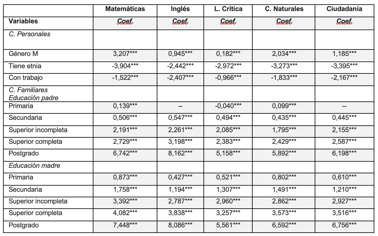 Por otro lado, en las cinco asignaturas estimadas se encontró que si un estudiante tiene trabajo su promedio disminuye comparado con un estudiante que no lo tiene; esta diferencia es mayor para sociales y ciudadanía, en donde es de 2,16 puntos menos; para inglés esta diferencia es de 2,40 puntos menos, para ciencias naturales es de 1,83 puntos menos, para matemáticas es de 1,52 puntos menos y para lectura crítica es de 0,96 puntos menos en comparación con un estudiante que no trabaje. Con respecto a las características familiares del estudiante, se observó que a medida que aumentan la educación mayor es el puntaje promedio obtenido en cada asignatura; en matemáticas, si el padre tiene una educación primaria, secundaria, superior incompleta, superior completa y postgrado obtiene en promedio 0,13 puntos, 0,50 puntos, 2,19 puntos, 2,72 puntos y 6,74 puntos respectivamente más que un padre sin educación; por otra parte, la educación de la madre presenta un mayor efecto en el puntaje: para una madre con educación de postgrado obtiene en promedio 7,44 puntos más que una madre sin educación. Este mismo efecto se presenta en las asignaturas de lectura crítica, ciencias naturales y sociales y ciudadanía, pero en cambio en inglés el efecto de la educación de un padre con postgrado es un poco mayor que el de una madre con postgrado. Por otra parte, en matemáticas, si la ocupación del padre o de la madre es de un asalariado, independiente, trabaja en el hogar, pensionado u otra actividad tiene un efecto negativo en comparación si es un empresario, en cambio en las otras cuatro asignaturas si la ocupación de la madre es de asalariada su efecto en el puntaje es mayor comparada con una madre que es empresaria. Con respecto a las características socioeconómicas, en donde si los estudiantes con un estrato medio para matemáticas obtienen en promedio 0,81 puntos más que uno de estrato bajo, para inglés obtienen en promedio 2,22 puntos más que uno de estrato bajo, para lectura crítica, para ciencias naturales y para sociales y ciudadanía obtienen en promedio 0,98 puntos, 0,73 puntos y 0,89 puntos más que uno de estrato bajo respetivamente. Igualmente, si el estudiante es de estrato alto el efecto es mayor para inglés, en donde se obtuvo en promedio 5,38 puntos más que uno de estrato bajo; en las otras asignaturas el efecto también es positivo.