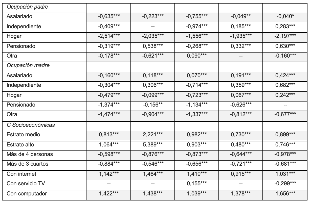 Por otro lado, los estudiantes con acceso a internet y computador obtienen un mayor puntaje en comparación con los que no cuenten con esas herramientas. También el efecto de que un estudiante tenga servicio de televisión es mayor para lectura crítica, en cambio para sociales y ciudadanía tiene un efecto menor, y para matemáticas, inglés y ciencias naturales dicha variable no es estadísticamente significativa. Estos resultados demuestran que en el país las condiciones socioeconómicas influyen en el rendimiento académico, tal como lo evidenciaron Tejedor y Caribe y Fuchs y Wößmann en la literatura.
