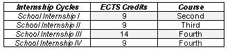 In the case of teaching degrees, its associated ECTS credits usually represent around a quarter of the entire degree at European level (Eurydice, 2013), coinciding with the dedication regulated by ECI Ministerial Order 3857/2007 in our country. Along these lines, the university degree of primary education teaching at Universidad Internacional de Valencia has four internship cycles, with a total of 41 associated ECTS credits, divided as follows: