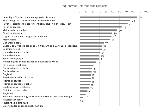 As can be seen, the subjects that students take most often from theory to practice are learning difficulties and developmental disorders (86 references), developmental and educational psychology (76 references) and psychological techniques for conflict resolution, social skills and emotional intelligence (72 references). Followed by ICT in education and mathematics teaching, with 63 and 56 references, respectively. On the other hand, with a smaller number of references, are the special emphasis in Valencian language (1 reference), the special emphasis in music (2 references), the physical education subject (5 references), research methodology and educational innovation (9 references) and English II (12 references).