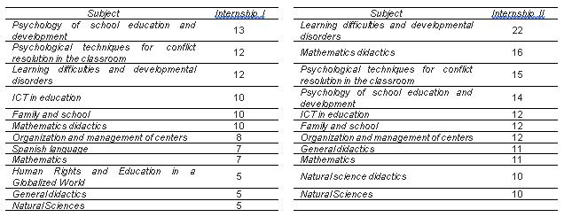 If we look at the course in which the different subjects are located in the curriculum, it cannot be said that there is a greater applicability than those that are carried out in the internship. An example of this is that, regardless of the course in which the internship cycles are held, the subjects that are transferred to a greater extent are between the first and second year. This aspect also exemplifies that there are eight subjects that are among the ten most referenced in the different internship cycles: psychology of school education and development, psychological techniques for conflict resolution, social skills and emotional intelligence, learning difficulties and developmental disorders, ICT in education, family and school, general didactics, organization and management of centers, mathematics and mathematics teaching.