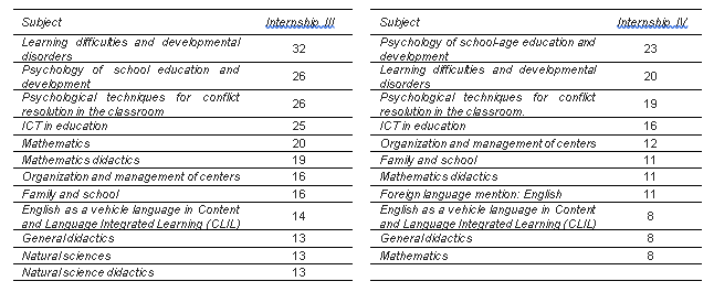 As can be seen, the four internship cycles have a lot of coincidences in the subjects that have been able to be transferred more frequently, with slight nuances depending on the cycles. While in Internships I, III and IV, the same subjects occupy the first three places, although in different positions (psychology of education and development at school age, psychological techniques for conflict resolution, social skills and emotional intelligence, and learning difficulties and developmental disorders), in Internship II psychology of education and development at school age is replaced by didactics of mathematics.