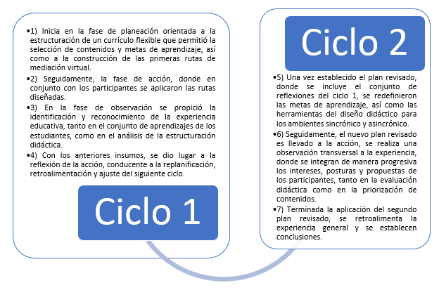 El método que encauzó el presente estudio fue la investigación acción técnica, orientada al diseño y aplicación de planes de intervención que permitan la solución de problemas educativos y el fortalecimiento de habilidades en los participantes, desde un enfoque encaminado a la resolución de problemas prácticos, donde se incorpora en el proceso investigativo a los actores educativos como dinamizadores de la experiencia práctica de solución de problemas (Colmenares & Piñero, 2008). Dentro del estudio, los investigadores propusieron la experiencia educativa de las rutas de mediación virtual como el plan orientado a la facilitación de aprendizajes significativos en tiempos de pandemia, que lograran minimizar el impacto psicosocial y pedagógico del trabajo en casa, favoreciendo una mayor adaptación a los nuevos ritmos de aprendizaje.