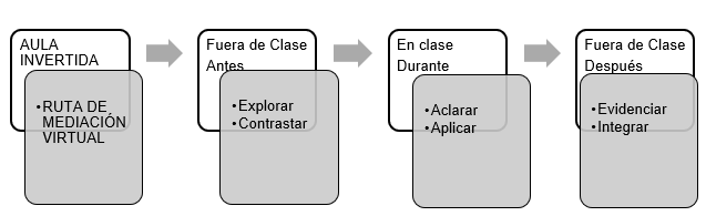 De este modo, las rutas de mediación virtual como modelo de aula invertida en el marco de la pandemia logran optimizar el supuesto del aprendizaje basado en el estudiante, facilitando el desarrollo de las competencias deseadas en armonía con ambientes sincrónicos apoyados por el maestro y asincrónicos mediados por TIC. El núcleo de la ruta de mediación virtual son los objetivos de aprendizaje articulados a los desempeños o competencias deseadas, las cuales se desarrollan en seis momentos pedagógicos: explorar, contrastar, aclarar, aplicar, evidenciar e integrar, mismos que son coherentes con el modelo de aula invertida.