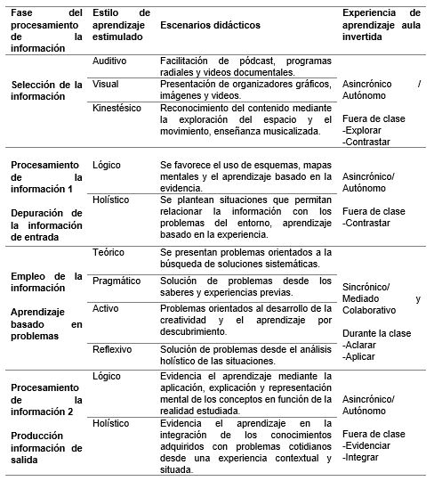 Los momentos didácticos de la ruta de mediación virtual se desarrollan desde la planificación de experiencias activas y colaborativas, centradas en los estudiantes. Para ello, la experiencia didáctica integró diversos recursos multimedia al proceso de enseñanza aprendizaje, se procuró atender la diversidad de estilos de aprendizaje, motivando el fortalecimiento de habilidades de pensamiento y destrezas mentales, de modo que el estudiante pueda interactuar con diversas fuentes de información que facilitan el aprendizaje de los contenidos. Desde esta perspectiva, las rutas de mediación virtual centran su interés en favorecer condiciones de estimulación autónoma y colaborativa, asociando algunos escenarios didácticos con las fases del procesamiento de información. La tabla 1 relaciona el proceso o rasgos distintivos, los estilos de aprendizaje, las herramientas de mediación y el momento del aula invertida.