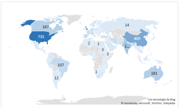 De los 4.367 documentos relacionados con la salud mental, se encuentran dos importantes centros de estudio de la pandemia, China y Estados Unidos, seguidos de Australia y Brasil, como se observa en el mapa No. 1