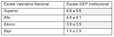 Los resultados numéricos que se asignan en el SIEP valoran los desempeños de los estudiantes con una escala comprendida entre 1.0 y 5.0, estos se reportan por periodos y se entregan a los padres y madres de familia como informe de los estudiantes. La escala valorativa institucional se encuentra en coherencia con la nacional, de modo que las convenciones se dan de la siguiente manera (Tabla 1):