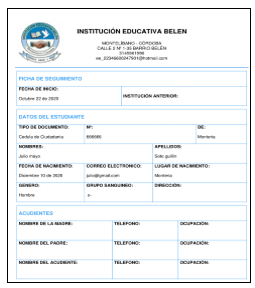 El municipio de Montelíbano, Córdoba, no es la excepción; uno de los ejemplos más claros de esto se encuentra en la Institución Educativa Belén, en la cual existen numerosos expedientes de estudiantes relacionados con el seguimiento al desempeño académico y disciplinario. Dicha información se encuentra en medio físico y está desorganizada, lo cual influye de manera directa en la ralentización del proceso de control. Los expedientes de los estudiantes están almacenados en bolsas plásticas, poniendo en peligro de pérdida, deterioro o fraude la información. Esta dificultad es mencionada por autores como Silva y Cárdenas (2014), cuando se refieren a la problemática que se genera en los procesos que se llevan a cabo de forma manual. Lo anterior permite afirmar que la metodología que se utiliza actualmente no es la adecuada para prestar el servicio en óptimas condiciones.