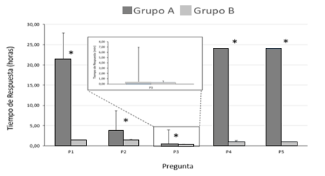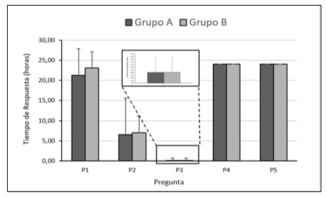 Los resultados del postest muestran una gran diferencia entre los tiempos de ambos grupos, siendo los tiempos del grupo experimental mucho menores. Se corrobora esto con el análisis ANOVA que arrojó un valor-P menor a 0,05 (ver tabla 1), lo que permite concluir que existen diferencias estadísticamente significativas entre los tiempos en que se realizaron las actividades en los grupos. A partir de estos resultados se puede afirmar que el proceso se optimizó, ya que los tiempos de realización de las tareas por parte de los docentes que utilizaron el software fueron mínimos.