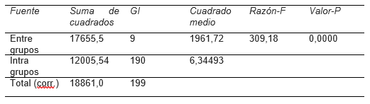 Para garantizar la homogeneidad de los resultados de los grupos se realizó un Análisis ANOVA, donde se descompone la varianza de los datos en dos componentes: un componente entre-grupos y un componente dentro-de-grupos. Puesto que el valor-P de la prueba-F fue mayor que 0,05, se concluye que no existen diferencias estadísticamente significativas entre las medias de las variables con un nivel del 95,0% de confianza o, en otras palabras, ambos grupos están en el mismo bajo nivel de eficiencia.