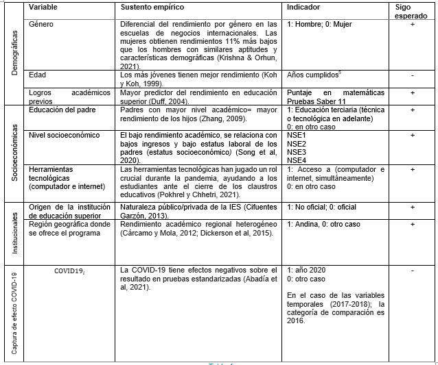 El logro educativo es un concepto complejo debido a su multi-dimensionalidad. Al respecto, la presente investigación se basa en la función de producción educativa,tomando de entre las diversas dimensiones, variables tradicionales de los evaluados, tales como género, edad, logros académicos previos, educación de los padres, nivel socioeconómico y características de las instituciones educativas; decantándose en la importancia de los logros académicos pre-universitarios, al considerarlos el principal predictor. Tomado este contexto, se analiza el efecto de la pandemia COVID-19 sobre los logros académicos en la competencia de razonamiento cuantitativo de evaluados de profesiones internacionales de Colombia, de acuerdo con las pruebas Saber Pro de los períodos pre-pandemia (2016-2019) y en pandemia (2020). Con relación a los efectos de captura, siguiendo el trabajo de Abadía et al (2021) se incluye una variable dicotómica, que toma el valor de 1 para los estudiantes que tomaron la prueba durante la pandemia (2020); utilizando también variables binarias para los períodos previos, excluyendo el año 2019 del análisis econométrico, dado sus comportamiento de outlier(reducción de la tendencia del puntaje en RC, e incremento más que proporcional, del número de evaluados durante ese año). Adicionalmente, se incluyen variables de acceso a herramientas tecnológicas (computador e internet en el hogar) (Ver Tabla 4).