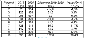 De acuerdo con los hallazgos expuestos en los hechos estilizados, se descarta la hipótesis de sesgo de selección debido al aumento neto del número de evaluados en 2020, jalonado este por la representatividad de los percentiles más altos (percentil 10 específicamente) (Tabla 3 y Figura 6).