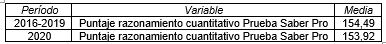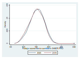 Siguiendo el trabajo de Abadía et al (2021), se emplea la combinación de cortes transversales (2016-2019 como base)., y la cohorte 2020, para verificar el efecto de la pandemia COVID-19 sobre el puntaje en razonamiento cuantitativo de evaluados de profesiones internacionales. Para el logro de este objetivo y con base en la Tabla 4, se utiliza la ecuación (2) para comparar los puntajes en RC de 2020 con los de 2016- 2019.