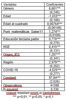 Con la finalidad de depurar los resultados, se decidió excluir del análisis final el año 2019, para capturar el efecto real de la COVID-19 sobre el logro educativo en razonamiento cuantitativo de los estudiantes en mención. Con la técnica de variables binarias se construye un indicador ficticio de captura de la pandemia y del comportamiento temporal del puntaje a lo largo de los años previos, observando que la COVID-19, tiene un significativo efecto negativo sobre el logro educativo en razonamiento cuantitativo, de los evaluados de profesiones internacionales (4,5 puntos menos respecto de 2019; y 7 puntos menos, con relación a las cortes 2016-2018). Por su parte, el acceso de los evaluados a herramientas tecnológicas (computador e internet) fue transcendente en el análisis al comportarse como catalizador del efecto adverso de la pandemia, pues dichas herramientas permitieron que estos continuaran sus actividades académicas de forma remota. Concretamente, los resultados evidenciaron que aquellos que contaron con computador e internet obtuvieron en promedio 2,17 puntos más en la prueba y, a su vez, la presencia de estas herramientas redujo el impacto negativo de la pandemia en 0,31 puntos; resultados coincidentes con la litertaura respectiva, la cual identifica una correlación positiva entre el uso de computador y el rendimiento académico, entendiendo que la fusión de estas variables captura los efectos de un mejor background socioeconómico del hogar.