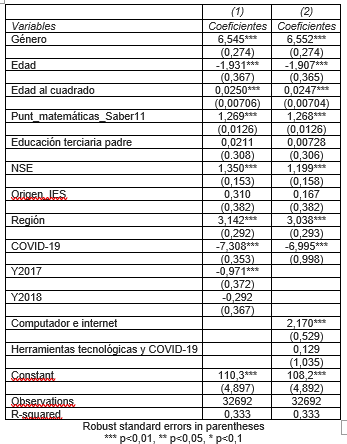 Con la finalidad de cuantificar el efecto diferencial de la COVID-19 sobre los estudiantes que tienen acceso a herramientas tecnológicas (computador e internet, simultáneamente), se estima la ecuación (4), la cual incluye una variable dicotómica con valor de 1 si el estudiante accede a ambas herramientas.