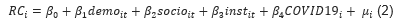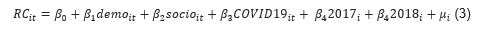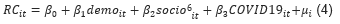 : puntaje en RC del estudiante .; covid19 variable dicotómica, con valor de 1 para los estudiantes que presentaron la prueba en 2020; demo vector de variables demográficas; socio; vector de variables socioeconómicas (sin incluir acceso a herramientas tecnológicas): vector de variables de la IES. El coeficiente de la dummy de captura del shock pandémico B4 (representa el efecto neto de la COVID-19 en el logro académico en RC de los evaluados. A partir de la ecuación (2), se vincula la serie 2016- 2018 mediante variables binarias, asumiendo 2016 como referencia.