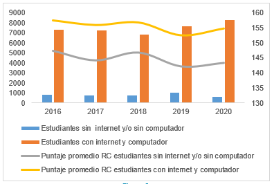 Respecto al acceso a herramientas tecnológicas por parte de los evaluados, la proporción de estos con acceso a computador y/o internet durante todo el período fue superior a 93%, siendo el puntaje promedio de la prueba 10 puntos mayor, en aquellos que cuentan con al menos una de las dos herramientas. A su vez, la proporción de evaluados que poseía simultáneamente computador e internet fue 90,3%, destacando que, en 2020, incrementó el número de los que poseen ambas herramientas (92,8%), respecto de los años previos (89,7%) (Figura 2). Estos resultados favorables se pueden atribuir a inversiones de los evaluados y/o de sus hogares, en la compra de herramientas para el desarrollo adecuado de las actividades académicas de manera remota, sumando a ello la capacidad de adaptación a las nuevas formas de enseñanza (Melo-Becerra et al, 2021).