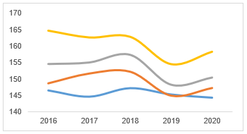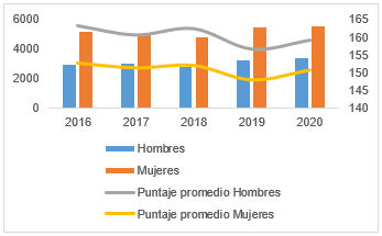 Respecto de la distribución por género, tal y como lo documenta la literatura, se evidencia la representatividad femenina (61,8% en 2020 y 62,8% promedio del período 2016-2019) (Perez-Felkner et al, 2020; Gevrek et al, 2020). La importancia de analizar de manera simultánea la participación y el logro académico por género en asignaturas cuantitativas se debe a que la brecha de puntaje entre hombres y mujeres es determinante de la segregación. Pese a la mayor participación, la Figura 3 muestra que el puntaje de las mujeres fue casi 10 puntos por debajo de los hombres durante los cinco años analizados, evidenciándose un leve crecimiento en el número de estudiantes en 2020 (4,7% en hombres y 1,6% en mujeres), siendo este significativamente inferior al crecimiento en 2019 (15,6% hombres y 14,4% mujeres). Este hallazgo sugiere que la pandemia COVID-19 redujo la tendencia de crecimiento del número de evaluados, la cual empezó a gestarse en el año pre-pandemia (Ver también Figura 1)..