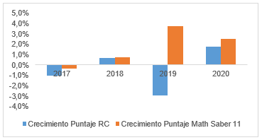 En cuanto a los logros académicos previos (puntaje en matemáticas en las pruebas de salida de la secundaria, Saber 11), se confirma su importancia en todos los años de análisis (Delaney y Devereux, 2019; Justman y Méndez, 2018), excluyendo de esta conclusión el 2019, año de mayor caída del puntaje promedio en RC.