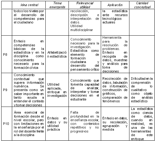 […] educarse estadísticamente representa un aporte a las competencias del estudiante en formación matemática, porque no solo aprende a fundamentarse en variables cuantitativos [sic.] sino además en variables cualitativas, que amerite la utilización en algún caso […] (P9).