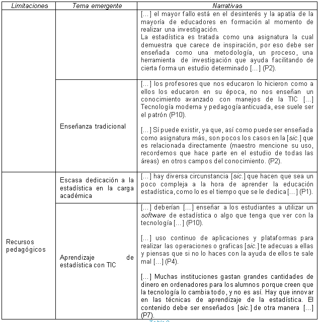En la tabla 3 se resumen los principales significados relacionados con la identificación de limitaciones en la formación estadística del futuro licenciado en matemáticas. Estas limitaciones se dividieron en tres grupos: Contenidos temáticos, Enseñanza-aprendizaje y Recursos pedagógicos y rol docente.