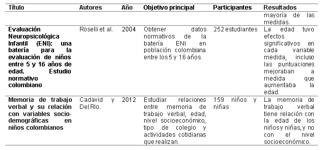 En la tabla 1 se describen las características de los estudios analizados concernientes al desarrollo de las funciones ejecutivas en escolares colombianos (n = 9). Estos artículos fueron publicados entre 2004 y 2019.