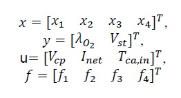 where 𝑥1=𝑊𝑐𝑝+45, 𝑥̇2=𝑥1 and 𝑥̇3=𝑥2. Considering the stack temperature 𝑇𝑠𝑡 as an additional state 𝑥4, a non-linear state space model for the PEM fuel cell is de-fined, whose inputs are the compressor control signal 𝑉𝑐𝑝 within [0%-100%], the load current 𝐼𝑛𝑒𝑡 and the ambient tempera-ture 𝑇𝑐𝑎,𝑖𝑛. The model outputs are the oxy-gen excess ratio 𝜆𝑂2 and the stack voltage 𝑉𝑠𝑡. The state-space model is given as fol-lows: