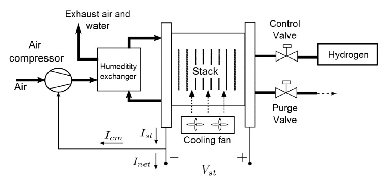 Fig. 1 depicts the physical configuration of a typical PEM fuel cell and the interaction among all its elements. The PEM fuel cell considered in this work is the Ballard 1.2 kW Nexa Power module, which uses hydrogen as fuel. The Nexa system provides run-time measures of stack temperature, air flow, stack current, and hydrogen consumption, among others.