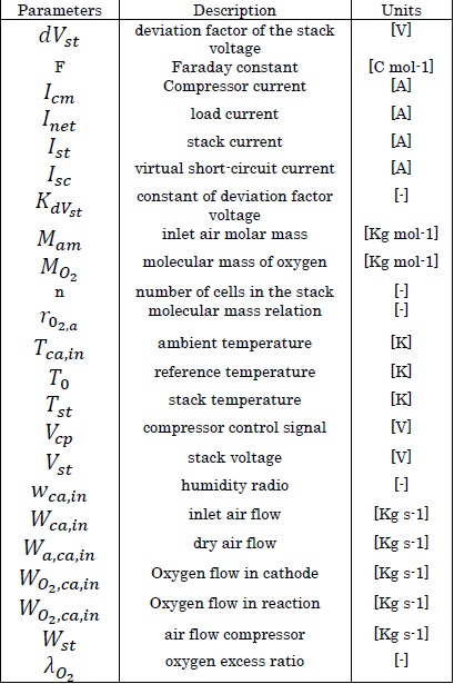 where 𝑀𝑂2=0.032 is the molecular mass of the oxygen, n=46 is the number of cells in the stack, F=96485 is the Faraday con-stant, 𝑟𝑂2,𝑎=0.2330 is the molar mass rela-tion between oxygen and dry air, which relates the oxygen flow available in the inlet dry air flow 𝑊𝑎,𝑐𝑎,𝑖𝑛. In addition, 𝑤𝑐𝑎,𝑖𝑛 is the inlet air flow, 𝑀𝑎𝑚=0.0288 is the humidity ratio, 𝑀𝑎𝑚=0.0288 is the inlet air molar mass. Finally, it is worth to men-tion that in the Eq. (15) is used to transform 𝑊𝑐𝑎,𝑖𝑛 from [𝐾𝑔∙𝑠−1] to [SLPM], be-cause 𝑊𝑐𝑝 is expressed in this unit. The non-linear model was validated through a set of experimental data from a 1.2 kW NEXA Power Module. Table 1 describes each variable and parameter with respec-tive units.