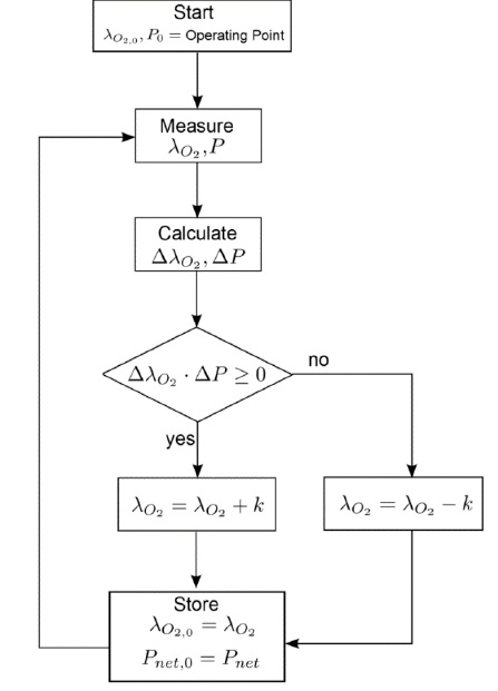 Source: authorsThen, the basic idea of the P&O algo-rithm is: starting from an initial value of the oxygen excess ratio 𝜆𝑂2,0 and net power 𝑃𝑛𝑒𝑡,0 given by an arbitrary operating point, the value of 𝑃𝑛𝑒𝑡 is increased, if the slope on the 𝑃𝑛𝑒𝑡 vs 𝜆𝑂2 curve is positive; or decreased, if the slope is negative; or re-mains constant, if the slope is zero, see Fig. 3. Thus, performing such strategy, an algo-rithm could be stated as follows: the pro-cess starts with initial values of 𝜆𝑂2,0 and 𝑃𝑛𝑒𝑡,0, both variables are measured and deltas values ( i.e. increments or decre-ments) are calculated; if both variables change in the same direction or remain equal ( 𝜆𝑂2∙𝑃𝑛𝑒𝑡≥0 ), the value of 𝜆𝑂2 is increased with a constant slope k. Similar-ly, if both variables change in different direction ( 𝜆𝑂2∙𝑃𝑛𝑒𝑡<0 ), the value of 𝜆𝑂2 is decreased with a constant slope k. Final-ly, the new values of 𝜆𝑂2 and 𝑃𝑛𝑒𝑡 are stored as 𝜆𝑂2,0 and 𝑃𝑛𝑒𝑡,0, respectively, for a further iteration, see the proposed flow chart in Fig. 4