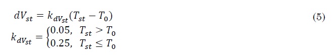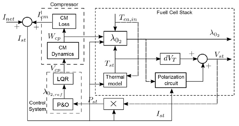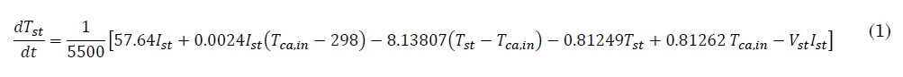 Using an energy balance, the tempera-ture of the stack 𝑇𝑠𝑡 is given by the Eq. (1), where 𝑇𝑐𝑎,𝑖𝑛 is the ambient temperature, 𝑉𝑠𝑡 is the stack voltage, 𝐼𝑛𝑒𝑡 is the load by the compressor and losses, while 𝐼𝑠𝑡=𝐼𝑛𝑒𝑡+𝐼𝑐𝑚 is the stack current obtained by adding both currents. The stack voltage and compressor current are given by the Equations (2-5), where 𝐼𝑠𝑐 is a virtual short-circuit current.