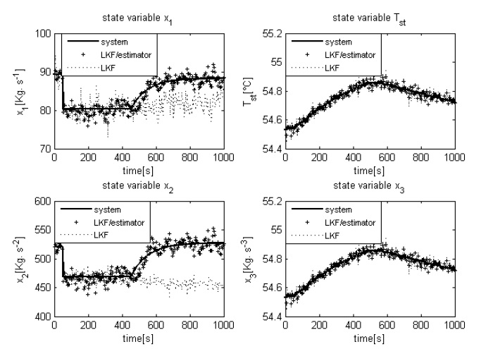 State space estimation of the Kalman filters. The estimation of the linear Kalman filter/estimator is represented by the symbol + and the former filter by the symbol.
