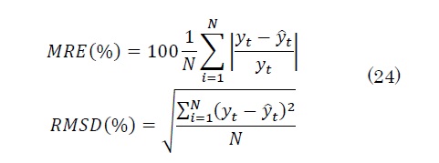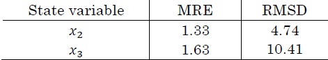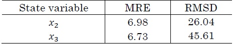 In such expressions N is the number of samples, while 𝑦𝑡 and 𝑦̂𝑡 are the system and estimated data, respectively. The val-ues of these metric errors are given in Tables 2 and 3. It must be point out that the RMSD error quantifies the standard deviation of the state estimations value from the real state value.