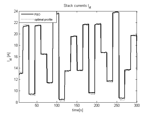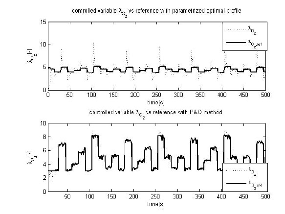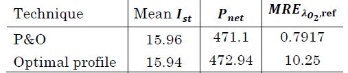 Considering that changes in the envi-ronmental temperature are neglected, the 𝑻𝒄𝒂,𝒊𝒏 was kept constant at the operating point. The performance of the control sys-tem was tested under a current demand profile 𝑰𝒏𝒆𝒕 depicted in Fig. 6, while the compressor current increases with time due to aging of the fuel cell. The simulation performance of the control system with the P&O algorithm and the parametrized op-timal profile is observed in Figs. 7-9. In addition, for assessing quantitatively the performance of both techniques, MRE er-rors for 𝝀𝑶𝟐, and mean values of net pow-ers and stack currents were obtained from the simulation and reported in Table 4.