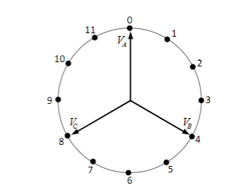 Paso 1: Establecimiento de la referencia de los fasores: la referencia es el fasor de voltaje de alimentación de la fase A en el primario del transformador. Se dibuja el fasor de voltaje de alimentación de la fase A que es la referencia de los ángulos y se ubica sobre el eje positivo de las abscisas marcando las cero horas en el reloj de pared. Luego se dibujan los fasores de voltaje para las fases B y C en secuencia positiva. El voltaje primario de la fase B está desfasado -120º marcando las 4 horas. Mientras que el voltaje de la fase C está desfasado 120º marcando las 8 horas. El método propuesto requiere que la red eléctrica tenga secuencia positiva que es la secuencia de las fases establecida para las tensiones de todos los sistemas eléctricos de potencia, en el caso de que el sistema eléctrico tenga un sistema de tensiones de secuencia negativa (conexión errónea) el método propuesto no podría utilizarse tal y como se plantea en este artículo. Este paso siempre es el mismo no dependiendo de la conexión o del tipo de transformador, por lo que la descripción de los ejemplos de la metodología se referirá para este paso siempre a la Fig. 1.