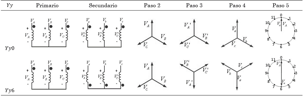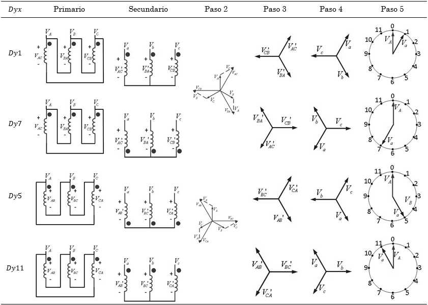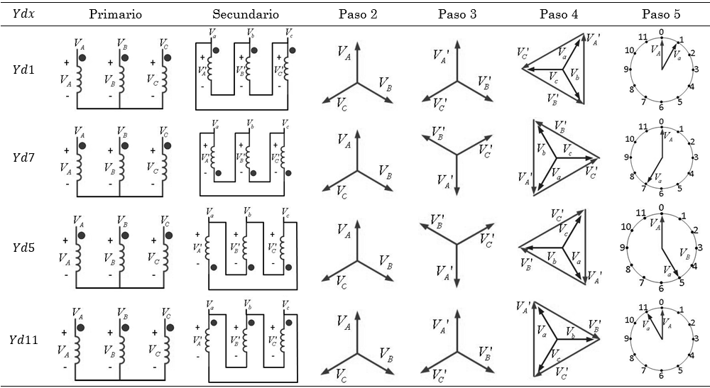 La conexión en y del secundario propicia camino de retorno para la corriente que va por el neutro en la instalación. La Tabla 4 describe la metodología para las conexiones 𝐷𝑦𝑥 (𝑥=1,7,11 y 5).