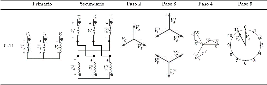 Paso 2: Determinación del voltaje de las bobinas del primario: la conexión 𝑌 en el primario indica que los voltajes que se establecen en las bobinas del primario coinciden con los fasores 𝑉𝐴,𝑉𝐵 y 𝑉𝐶, ver fasores de la cuarta columna de la Tabla 1