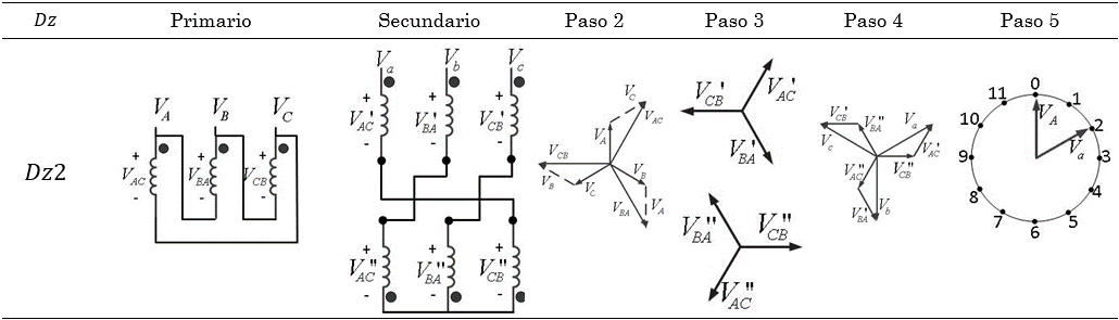Las conexiones 𝑌𝑧𝑥 y 𝐷𝑧𝑥 suelen usarse para aterrizar líneas de transmisión, debido a que el neutro de la conexión zig-zag propicia un camino para las corrientes de secuencia cero o armónicos de corriente de tercer orden. La conexión zig-zag también propicia la eliminación de armónicos de tensión de tercer orden disminuyendo el desequilibrio de tensión que puede generarse en líneas de transmisión. Debido a la conexión zig-zag, existen gran cantidad de combinaciones. Por lo que, las Tablas 5 y 6 solo describe la metodología para las conexiones 𝑌𝑧11 y 𝐷𝑧2, respectivamente. Otras conexiones que incluyen devanados en conexión zig-zag pueden obtenerse fácilmente siguiendo la metodología propuesta.