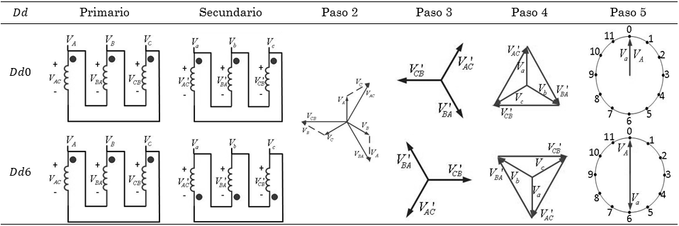 Las conexiones 𝐷𝑑 corresponden a los transformadores que tienen conexión 𝐷 en el primario y conexión d en el secundario. Una de las aplicaciones más importantes para el grupo de conexión 𝐷𝑑 es la interconexión entre sistemas de transmisión y subtransmisión, ambos sistemas requieren la conexión delta para ahorrar el cable del neutro. Si el primario y secundario tienen la misma polaridad, el desfase entre 𝑉𝐴,y 𝑉𝑎 es de 0º (𝐷𝑑0). Si el primario y secundario tienen la polaridad contraria, el desfase entre 𝑉𝐴, y 𝑉𝑎 es de 180º (𝐷𝑑6). La Tabla 3 describe la metodología para las conexiones 𝐷𝑑0 y 𝐷𝑑6.