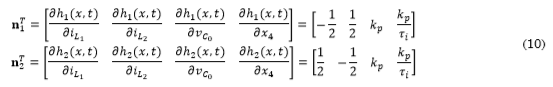Para el caso de un convertidor buck entrelazado existen 𝑛 señales de control, es decir una señal de control por cada fase, donde las señales diente de sierra tienen un desfase de 𝜙 = 2𝜋𝑘/𝑛 con 𝑘 = 1,2,3, ⋯, (𝑛 – 1). Esto implica que el convertidor buck entrelazado de dos fases tiene las siguientes condiciones de conmutación, donde n𝑇 es un vector normal con respecto a cada una de las variables de estado reportado en (10).