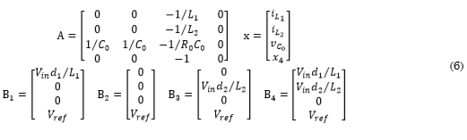 La matriz de estados A, las cuatro ma-trices de entrada B1, B2, B3 y B4, y el vector de estados x, se presentan en (6). En estos espacios de estado se introduce una cuarta variable de estado X4 para representar la integral del error de voltaje. Esta variable se requiere para estimar la parte integral del controlador PI con el cual se regulará la tensión de salida.