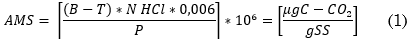 Donde, la AMS es la actividad microbiana del suelo, B es la titulación en blanco, T es la titulación muestra de suelo, N HCl es la normalidad del ácido, P es la masa seca de la muestra y 0,006 es el factor de dilución.