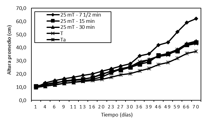 El tratamiento 25 mT - 7 ½ min presentó los mejores resultados en todas las mediciones realizadas en el periodo de evaluación. Este tratamiento generó diferencias estadísticamente significativas (P ≤ 0,05) en las variables de respuesta en comparación con los tratamientos T y Ta, superando al T y al Ta, respectivamente, en 18 % y 40,1 % para la longitud de la planta (Fig. 3).