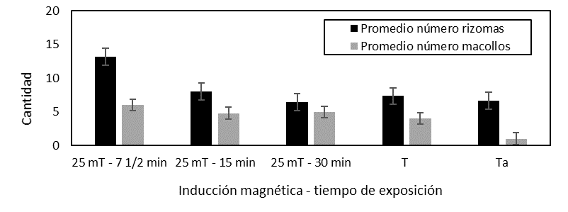 El tratamiento que mostró el mayor número de rizomas y con mayor significancia estadística según la prueba de Tukey (P ≤ 0,05) corresponde al tratamiento 25 mT - 7 ½ min, que superó al Ta en términos de número promedio de rizomas en un 98 % y a la vez superó al T en el número promedio de rizomas en un 80 % (Fig. 4).