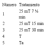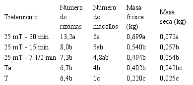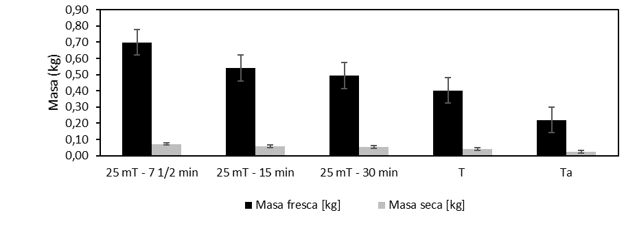 La prueba de Tukey (P ≤ 0,05) indicó que la mejor masa fresca correspondió al tratamiento 25 mT - 7 ½ min el cual superó en promedio al Ta y al T en 217,4 % y 73,7 %, respectivamente.