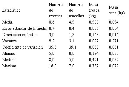 Se verificó la dispersión de los datos con estadísticos descriptivos (Tabla 3) para las variables de respuesta: número de rizomas, número de macollos, masa fresca y masa seca en kg.