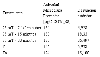 Los datos encontrados superaron los resultados de varias investigaciones que establecieron rangos de respiración obtenidos en laboratorio, para suelos agrícolas (15-32 µgC-CO. gSS-1) y suelos enmendados (53-86 µgC-CO. gSS-1) [22] donde los mayores valores llegaron hasta 85,1 µgC-CO. gSS-1 mientras que para este trabajo de investigación el mayor valor registrado fue 184 µgC-CO. gSS-1, cabe resaltar que este valor está asociado al tratamiento 25 mT - 7 ½ min que mostró los mejores resultados de las variables de respuesta analizadas (Tabla 5).