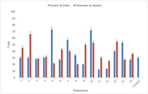 Para el medio de cultivo con acetato de sodio, se observa que con los tratamientos T5 y T10 se obtuvieron las mayores concentraciones de carbohidratos (73 y 72% p/p respectivamente) las menores concentraciones se obtuvieron en los tratamientos T11 y T12. A diferencia del acetato, solo uno de los experimentos (T2) obtuvo porcentajes de carbohidratos mayores al 50% con un valor de 66% p/p.